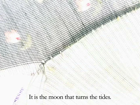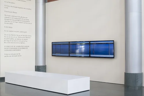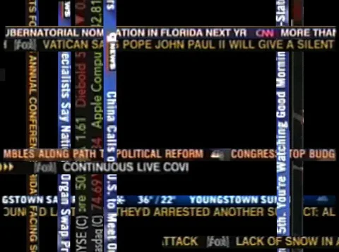 A work treating the television ticker as material. The moving text weaves together to comment on the constant bombardment of information emitted by television news.